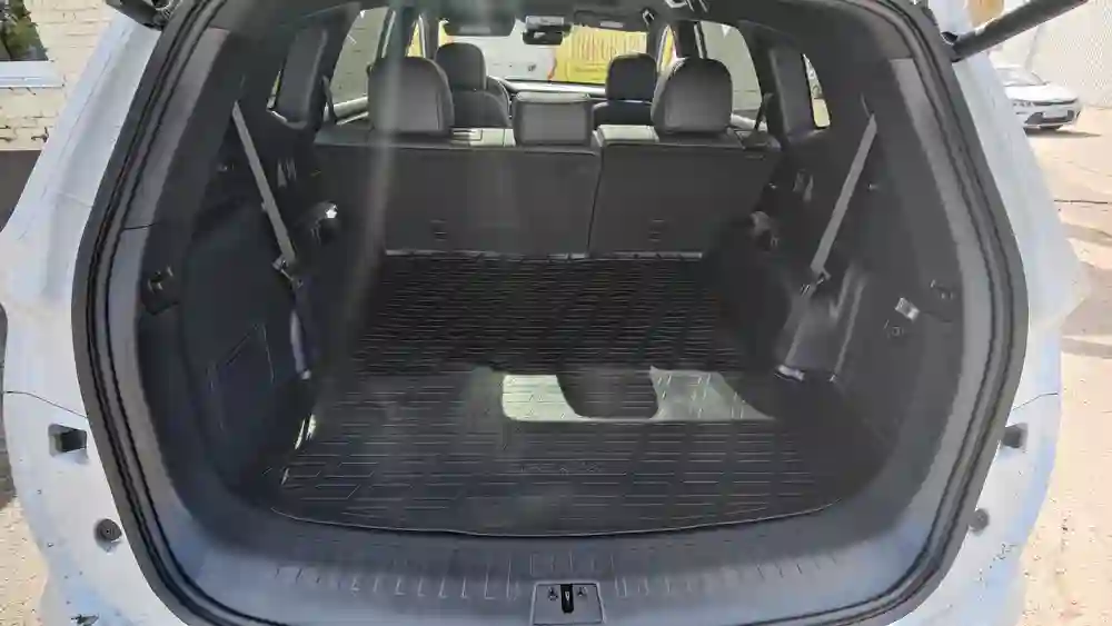 При сложенных сиденьях третьего ряда багажный отсек становится весьма вместительным – на глаз не менее полкуба. Прикрыть его можно рулонной шторкой, которая до сих пор лежала в подполе позади спинок кресел третьего ряда.